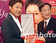 香港管弦乐团十一月五日在香港举行《港乐.叶丽仪DIVA》记者会,该团与著名歌星叶丽仪合作将于除夕晚举行两场演出,图为赞助商恒生银行在会上向叶丽仪致送纪念品。中新社记者:钱兴强
