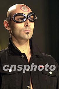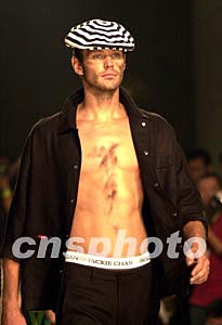 成龙系列男装(二00四年春夏季男装)中国揭幕式暨时装展十一月五日晚在广州举行,外籍男模激情演绎“龙旋风”时装。作者:陈文