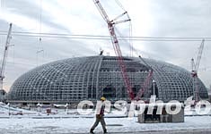 六日晚至七日晨,一场大雪突袭北京。正在建设的国家大剧院穹形屋顶钢结构骨架被大雪覆盖,安装焊接工作被迫暂停。中新社记者:张炜