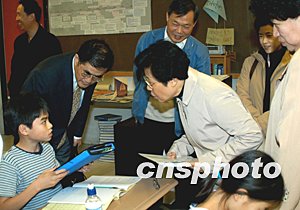 国务院侨务办公室主任陈玉杰(中)率团赴麻省剑桥市考察当地中文学校教学情况。图为她关切地向正在上中文课的九岁华裔男童何颂志(左)要考试试卷。中新社记者:陈建