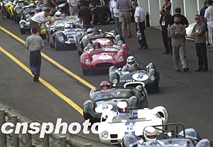 第五十届澳门格兰披治老爷车大赛八日举行大赛车纪念杯及金禧杯排位赛,图为参赛的老爷车队正在向赛场挺进。中新社记者:李刚