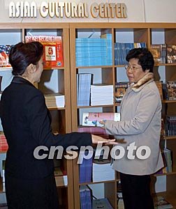 美东时间11月8日上午,中国国务院侨务办公室主任陈玉杰(右)来到波士顿亚洲文化中心参观,并在那里与当地华侨华人代表举行侨情座谈会。图为波士顿亚文中心主任魏晶向陈玉杰介绍情况。陈建 摄