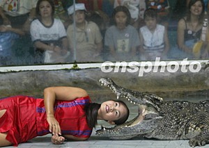 闻名泰国的是拉差公园已成为外国游人的必到之处,周末,美女与鳄鱼共同演出时的亲近之举令人心惊。中新社记者:赵振清