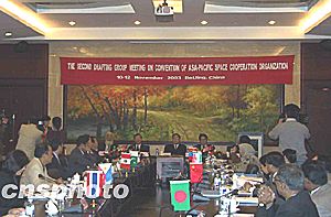 来自孟加拉国、巴西、中国、韩国、伊朗、马来西亚、蒙古、秘鲁、菲律宾、俄罗斯、泰国、巴基斯坦、乌克兰等十五个国家的政府官员,以及联合国有关机构的代表和观察员出席亚太空间合作组织第二次章程起草会议。中国国家航天局局长栾恩杰致辞时说,中国政府将一如既往地支持亚太空间合作组织的建立及所开展的合作,希望亚太空间合作组织早日建立。
