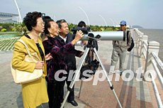 10日首次来厦门与养子傅宗汉相会的92岁金门老大娘翁李荣旦在两家亲人的陪同下,游览厦门名胜古迹及新景观厦门环岛路、会展中心等地。图为金门老大娘翁李荣旦在厦门环岛路通过高倍望远镜观看金门。作者:向天