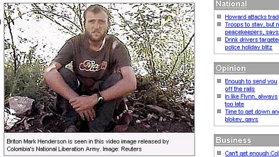 在录像当中,全副武装的叛军士兵身着迷彩服,时刻监视人质的一举一动,画面背景中飘动着哥伦比亚解放军的红黑两色军旗。