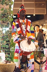 法国参展商出动黑人乐手击鼓高歌助兴美容展。中新社记者:洪少葵