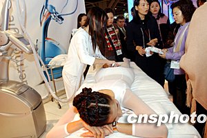 在香港举行的“2003亚太区美容展”上,香港菲莱雅公司在现场推介美容和瘦身疗法,吸引众多爱美女士围观。中新社记者:洪少葵