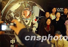 十一月十五日,梦系太空——人类航天事业历程与成就展在北京中国科技馆揭幕,来自北京华文学院的海外侨生们兴致勃勃与心仪已久的太空英雄杨利伟合影留念。中新社记者:武仲林