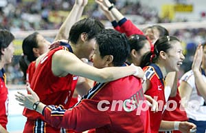 令人惊叹的是,中国女排队员此时并没有表现出因事实夺冠而产生的过度兴奋,只是淡然微笑着走向场边,准备第三局的最后一搏。她们的目标非常明确:全胜夺冠,不给自己留下任何遗憾。这正是她们追求达到的一种忘我境界。