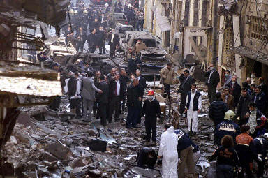第一起爆炸发生在伊斯坦布尔最大的犹太教会堂外,另外一起爆炸发生在离这座教会堂5公里外的另外一座犹太教会堂。两座教会堂已经严重受损,部分建筑已经倒塌,浓浓的黑烟从现场冒出,到处都是碎玻璃、扭曲变形的金属。