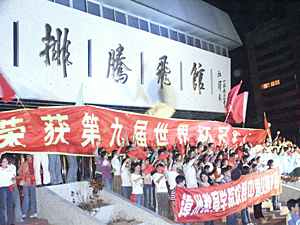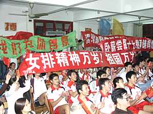 漳州高校学生与群众会聚在中国女排腾飞馆前欢庆中国女排夺冠。作者:蔡文原