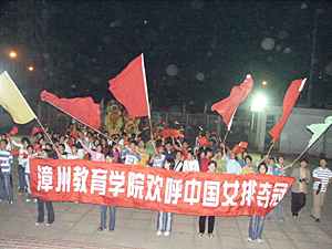 漳州高校学生上街游行,欢庆中国女排夺冠。作者:蔡文原