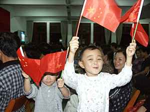 漳州各界欢庆女排夺冠。图为一少年手舞小红旗,庆祝女排夺冠。作者:蔡文原