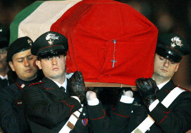 11月15日,在意大利驻伊宪兵总部爆炸中遇难的19名意大利人灵柩被运抵意首都罗马。11月12日,驻扎在伊拉克南部城市纳西里耶的意大利宪兵部队总部遭受汽车炸弹爆炸袭击,造成至少19名意大利人和9名伊拉克人死亡,上百人受伤。
