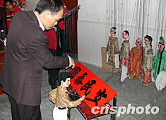 中国木偶表演大师李新贤正在用十四根细小的棉线操纵一只小小木偶写出一幅笔划遒劲的毛笔书法,被誉为“梅州一绝”、木偶神手。作者:卜瑜