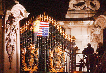 图:英妇女抗议布什访英竟攀爬白金汉宫大门