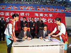 十一月十八日是海南大学建校二十周年纪念日。海南大学和中国农业银行十一月十八日在海大举行银校合作签字仪式,中国农业银行在未来五年将向海南大学提供十亿元人民币的信誉贷款额度,为海南大学加快发展提供资金保障。作者:王辛莉