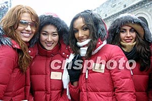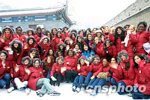 “世界小姐北京行”十九日在北京八达岭长城巡游,一百余名世界小姐冒着大雪在长城脚下合影留念。中新社记者:廖文静