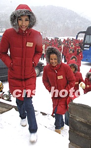 世界小姐北京行十九日来到八达岭长城进行巡游,来自世界各地的美丽小姐在雪中互相扶持攀登长城结下深厚友谊,图为韩国小姐(左二)和乌克兰小姐(右二)。中新社记者:廖文静