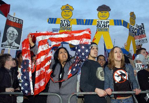在布什访英的第一天,数百名英国反战示威者在伦敦举行了示威活动。他们不仅高举着各种口号旗帜,还有人装扮成布什形象。布什也并没有给布莱尔政府留面子,公开历数了欧洲人的种种“不是”,让伦敦方面大为难堪。