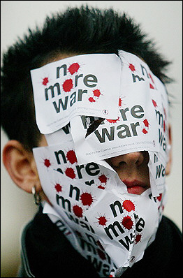 一名抗议者在脸上贴满反对伊战的标语。