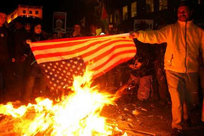 示威者焚烧美国国旗。
