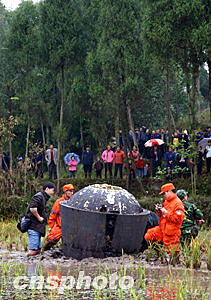 十一月二十一日,中国第十八颗返回式科学试验卫星成功返回。西安卫星测控中心正在用直升飞机吊装返回式卫星,准备送往指定地点。作者:孙阳