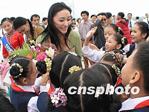 世界小姐参赛佳丽对前来欢迎的小朋友们十分亲善。赵晓兵 摄