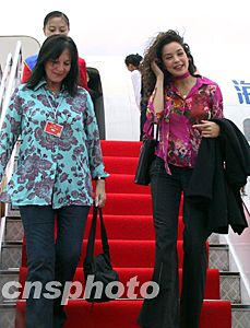 刚走下舷梯的世界小姐机构主席朱莉娅·莫莉(左)与二00二年世界小姐阿金 (右)。关向东 摄