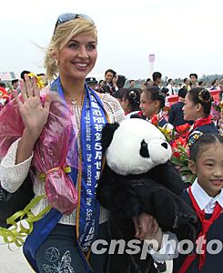一位参赛佳丽怀抱中国国宝大熊猫纪念品。关向东 摄