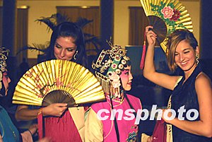 巴西小姐(左二)和葡萄牙小姐(右一)对中国京剧花旦演出的折扇情有独钟。中新社记者:廖文静