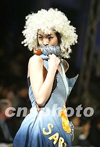 正在北京举行的中国国际时装周上,设计师以SARS字样配以简洁的服装与面部围巾,提醒人们预防SARS卷土重来。中新社记者:毛建军