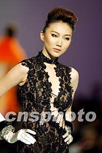 NE.TIGER在正在北京举行的中国国际时装周上展示的一款黑色镂花皮草服装,将皮草制作工艺与服饰美感发挥到极至。中新社记者:毛建军
