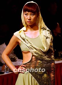 十一月二十五日在北京举行的“杉杉杯”中国时装设计新人奖评选中,多位来自大学的年青新秀展示反战主题时装,用军绿色搭配战争生活的混乱。中新社记者:贾国荣
