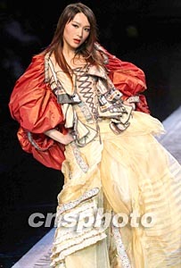 十一月二十五日晚,紫禁城的四季·马克张春夏高级时装发布会在北京中国大饭店举行,著名时装设计师张肇达通过对东方精神的探索、对中华文明的理解和把握,用服装语言诠释了紫禁城的独特气质。图为模特展示一款雍容华贵的时装。中新社记者:盛佳鹏
