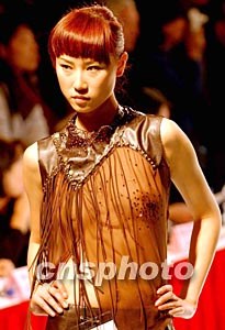 一名模特身著中国大学生设计的咖啡色透视装,展示迷人风采,参加十一月北京举行的“杉杉杯”中国时装设计新人奖评选。中新社记者:贾国荣
