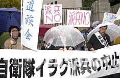 十二月一日中午,日本“和平遗族会”等多个民间团体和普通市民在首相官邸前举行示威,反对向伊拉克派遣自卫队。此前,日本两名外交官在伊拉克遭袭身亡,该事件在日本社会引起震动。中新社记者:王健