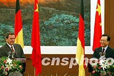 中国国务院总理温家宝、德国总理施罗德十二月一日在出席中德双方签字仪式后,共同会见中外记者。中新社记者:满会乔