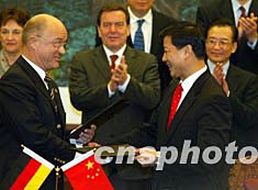 中德双方十二月一日在北京签署多个合作文本,中国总理温家宝、德国总理施罗德共同出席签字仪式。中新社记者:满会乔