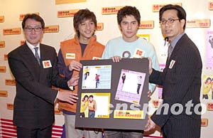 乐坛组合Shine成员黄又南、徐天佑12月2日在香港出席《Kodak数码冲晒多面睇》记者会,Kodak更设计了一套三款的「Kodak ×Shine 2004慈善相片年历」予香港世界宣明会作慈善用途。中新社记者:邓庆乐