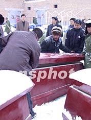 记者在现场看到,从早晨十时起,大家便井然有序地开始安葬工作。墓坑是由七十六团安排挖掘机统一挖掘的;死者置入棺内后,有的放到马爬犁上由老人赶着运到墓地,有的则由团里安排的汽车统一运送到墓地……汉族、蒙古族死者分别葬在两处墓地。