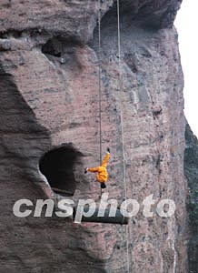 十二月,江西省鹰潭市龙虎山风景名胜区工作人员向游人重现两千年前古人吊装悬棺的惊险过程。该景区拥有数百座崖墓,这些崖墓距水面十至六十米之间的峭壁上,专家认为古代人是利用木绞车、土滑轮、绳索等工具将棺木吊上悬崖洞穴中的。中新社记者:王丽南