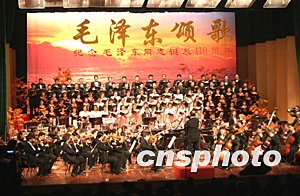 为纪念毛泽东诞辰110周年,《毛泽东颂歌大型音乐会》十二月五日晚在北京民族宫剧场举行。中国最高级别文艺团体演出的歌唱毛泽东颂歌,让人回忆起激情燃烧的岁月。中新社记者:史利