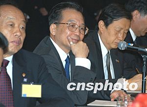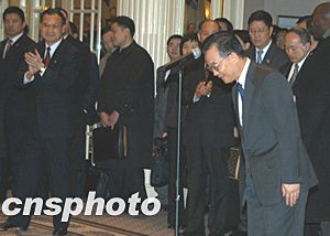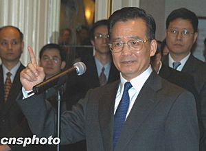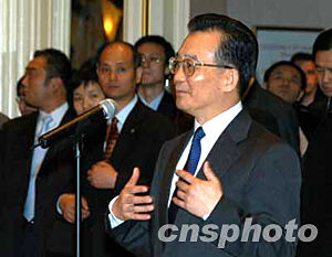 美东时间十二月七日下午,中国总理温家宝甫抵纽约,即接见华侨华人、留学生和中资机构代表。温家宝说,大家冒着严寒风雪,守候在这里好几个小时,欢迎我和我的同事。大家的这份情意,不仅是给我和同事的,更是给祖国和人民的。他代表中国人民和中国政府,向旅居在美国的华侨、华人、留学生,向来自香港、澳门和台湾的同胞,向领馆的工作人员,致以亲切的问候和良好的祝愿。随后他向前方和左右三鞠躬,感谢侨胞们的热情欢迎。作者:陈建