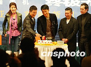 出席《无间道Ⅲ》北京记者见面会的黎明十二月八日切下生日蛋糕,接受朋友的祝福。中新社记者:郑萍萍