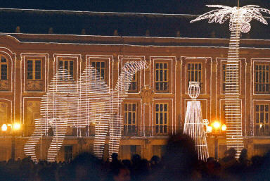 哥伦比亚首都波哥大的市民聚集在玻利瓦尔广场观看装饰的多姿多彩的节日彩灯。