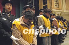 北京警方十二月九日对在冬季百日会战以来查处的聚众赌博、吸毒贩毒、制假贩假等五十余名违法犯罪人员进行公开处理。中新社记者:任海霞