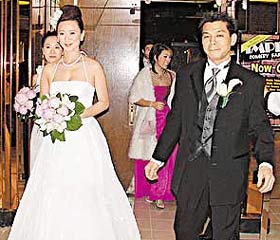 翁虹前日在大西洋城举行婚礼的场地,共用了4000朵鲜花来布置,包括粉红色玫瑰、百合和绣球花等十种,连酒席和亲友住宿等开支,整个婚礼约花费了150万港元。
