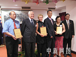 中国驻悉尼总领事廖志洪11日举行新南威尔士州中文教师招待会,新州上议员曾筱龙,麦考理大学中文系主任、原澳大利亚驻中国大使馆文化参赞康丹教授及新州教育培训部官员,从事中文教学的教师和教学管理人员一百多人与会。廖志洪说,中文教师在新州非英语语言中名列第一,新州选修中文的学生去年已逾一万七千名。图为廖志洪(右一)、曾筱龙(右三)和康丹(左二)与获颁奖状的新州教培部语言处、新州中文教师协会和新州中文教育理事会的负责人一道合影。中新社记者刘雨生摄